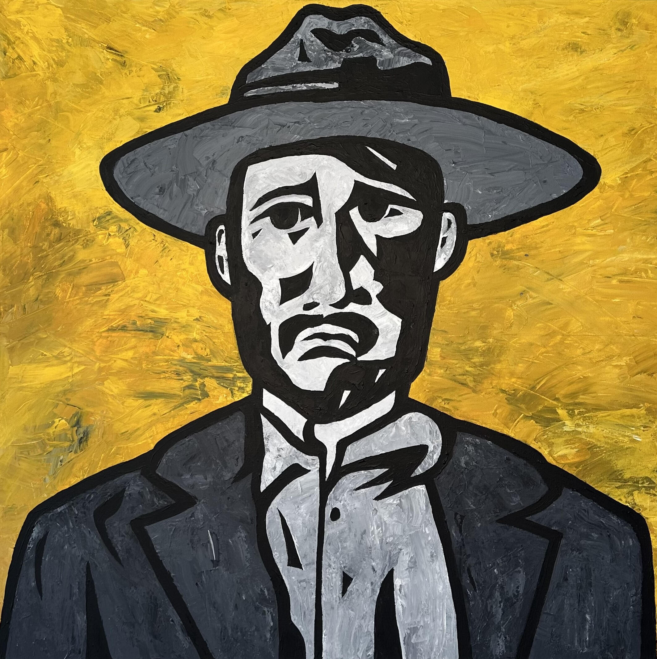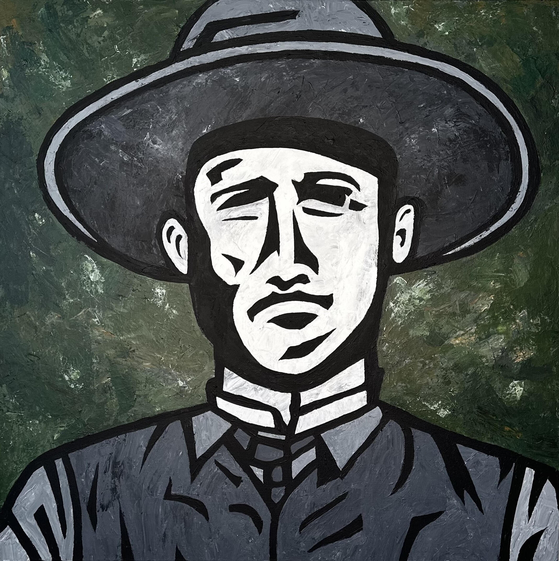 Inspired from an old photograph from Texas history, "Texas Ranger" pays tribute to the legendary lawmen who brought justice to the untamed frontier. With bold lines and a hardened gaze, the painting captures the courage, authority, and quiet resolve of a figure shaped by duty, danger, and the rugged land of Texas.