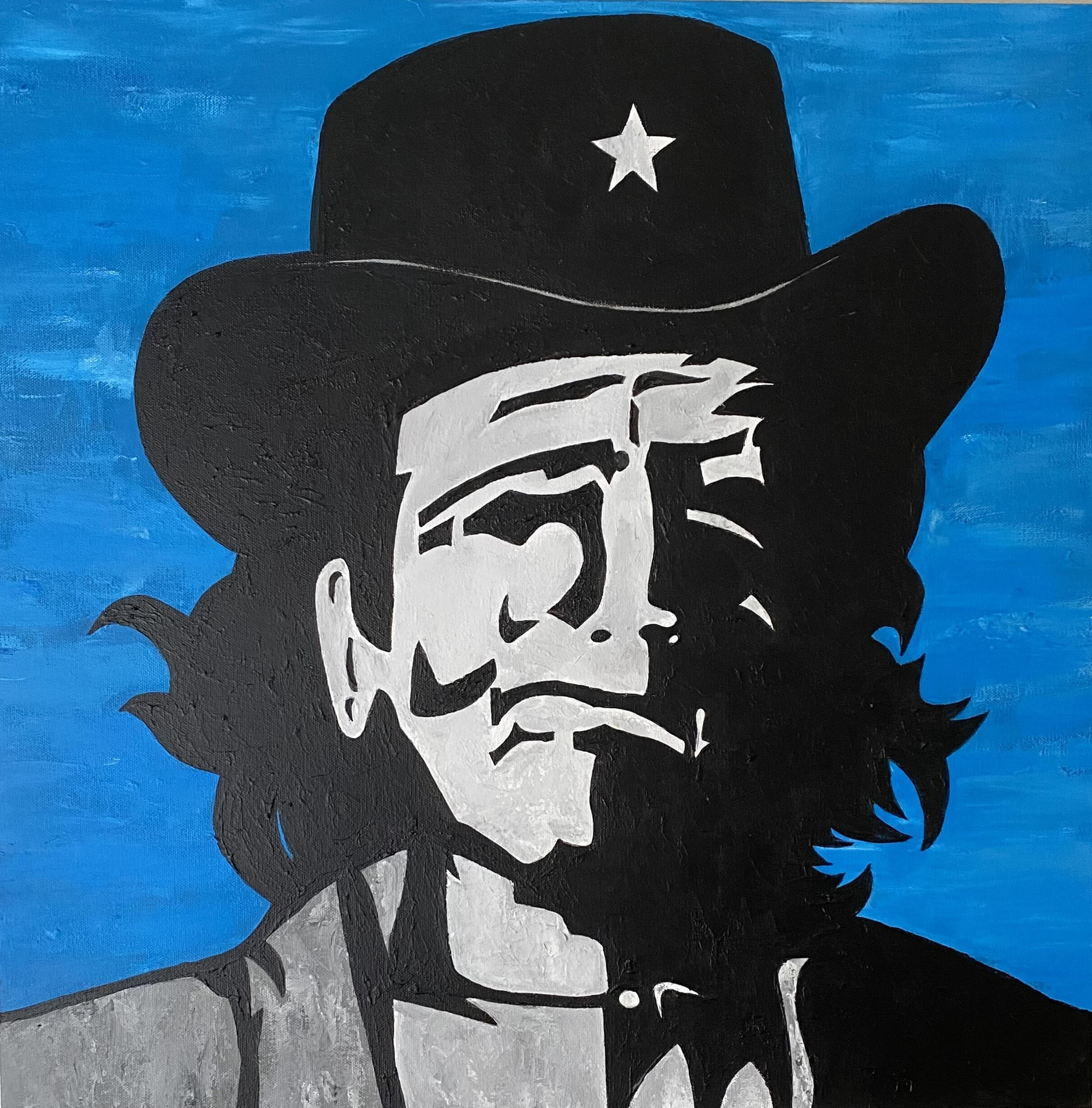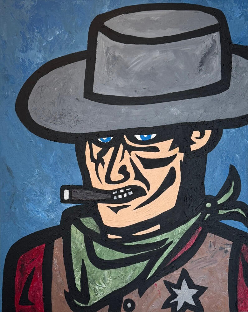 Bold, graphic lines and a rugged palette bring this modern Western outlaw to life. Sheriff captures the grit and swagger of the frontier with a pop-art edge — steely blue eyes, a clenched cigar, and a hint of menace behind the badge. Blending vintage comic-book energy with contemporary Western iconography, the piece channels both Americana nostalgia and sharp, modern style.