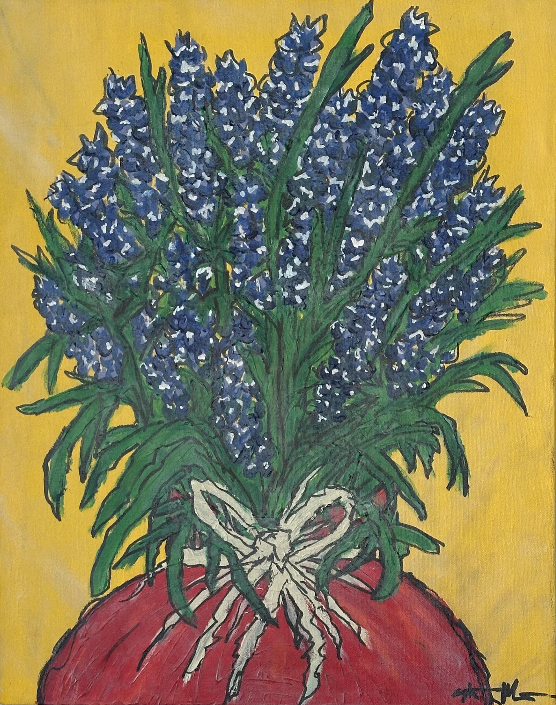 "Bluebonnets" captures the spirit of Texas through its beloved state flower. Set against a warm golden background, the bold strokes and vivid hues celebrate the wild beauty and resilience of spring in the Lone Star State. The still life arrangement blends simplicity and pride—a tribute to nature’s color and the enduring heart of Texas.