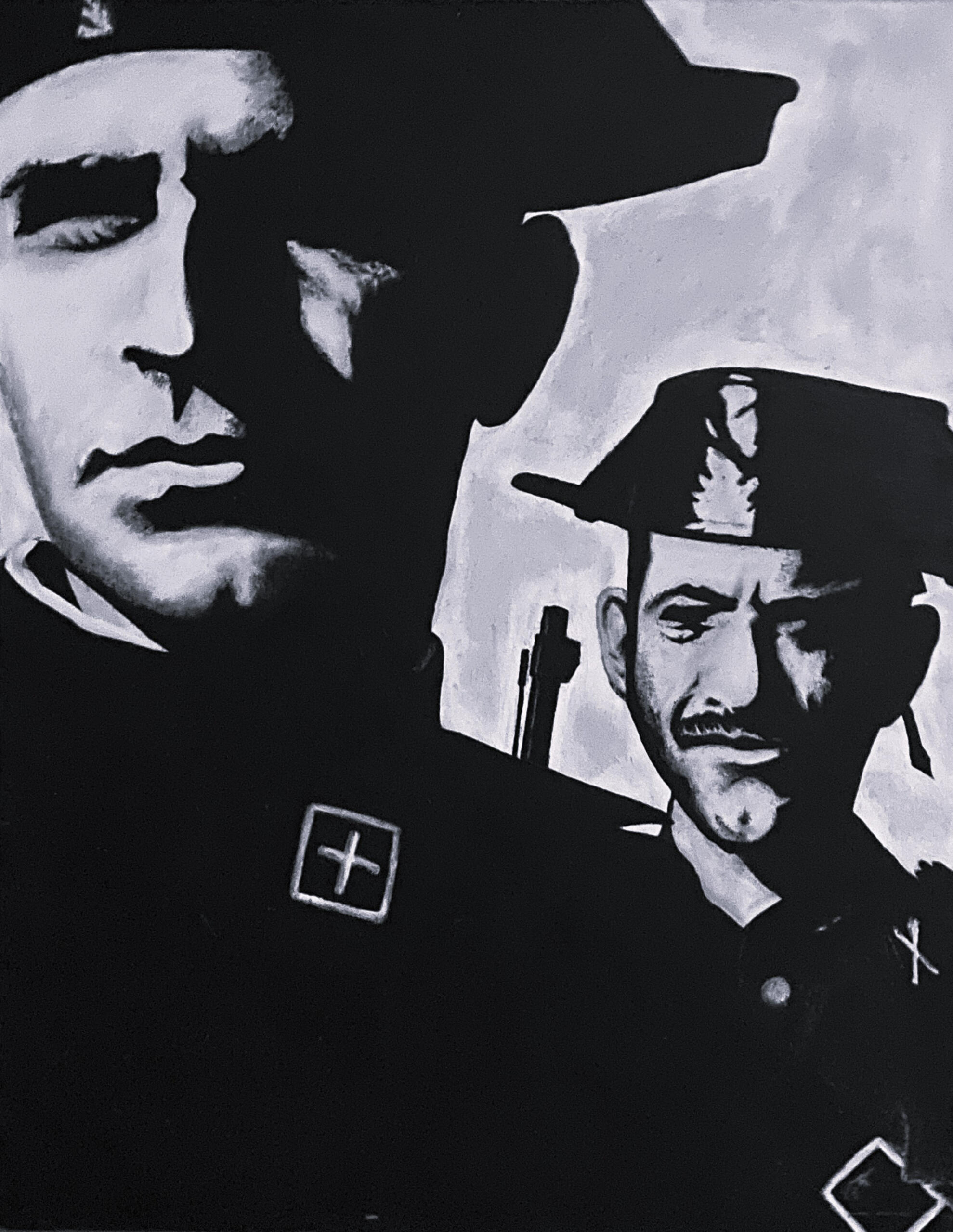 "Guardia Civil" was inspired by historical images of Spain’s national police force. The stark black-and-white contrast reflects authority, tradition, and tension—capturing both the stoic power and complex legacy of these iconic figures.