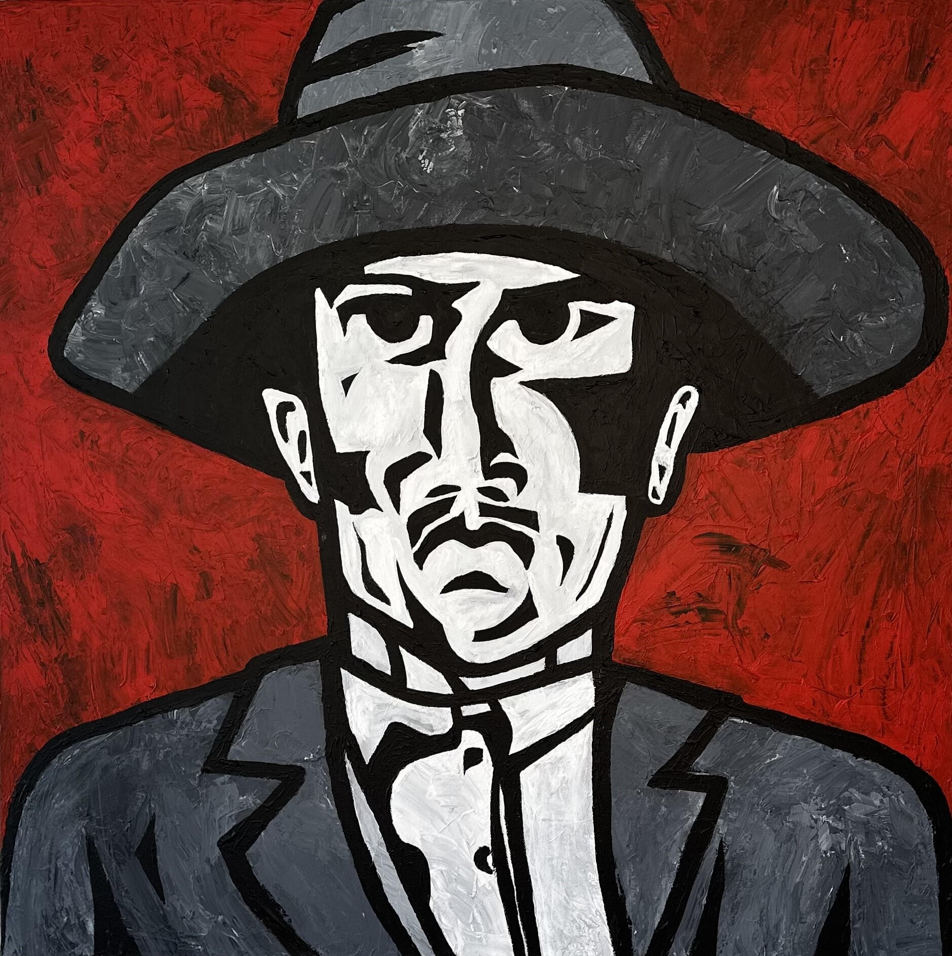 “Desperado” is inspired by an old photograph of a lone cowboy, capturing the grit, mystery, and quiet defiance etched into a weathered face. A modern, bold tribute to the timeless outlaw spirit of the American West.