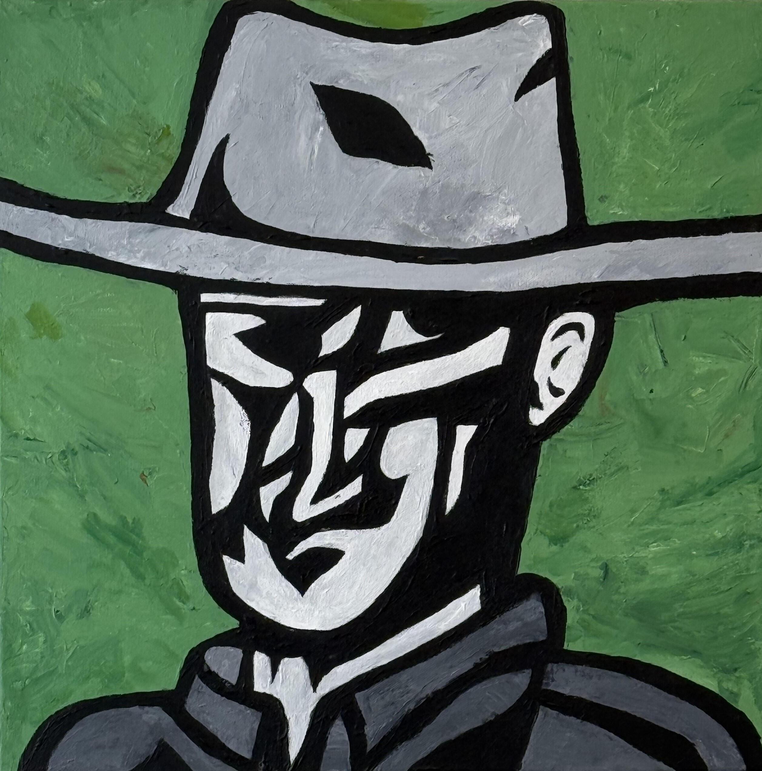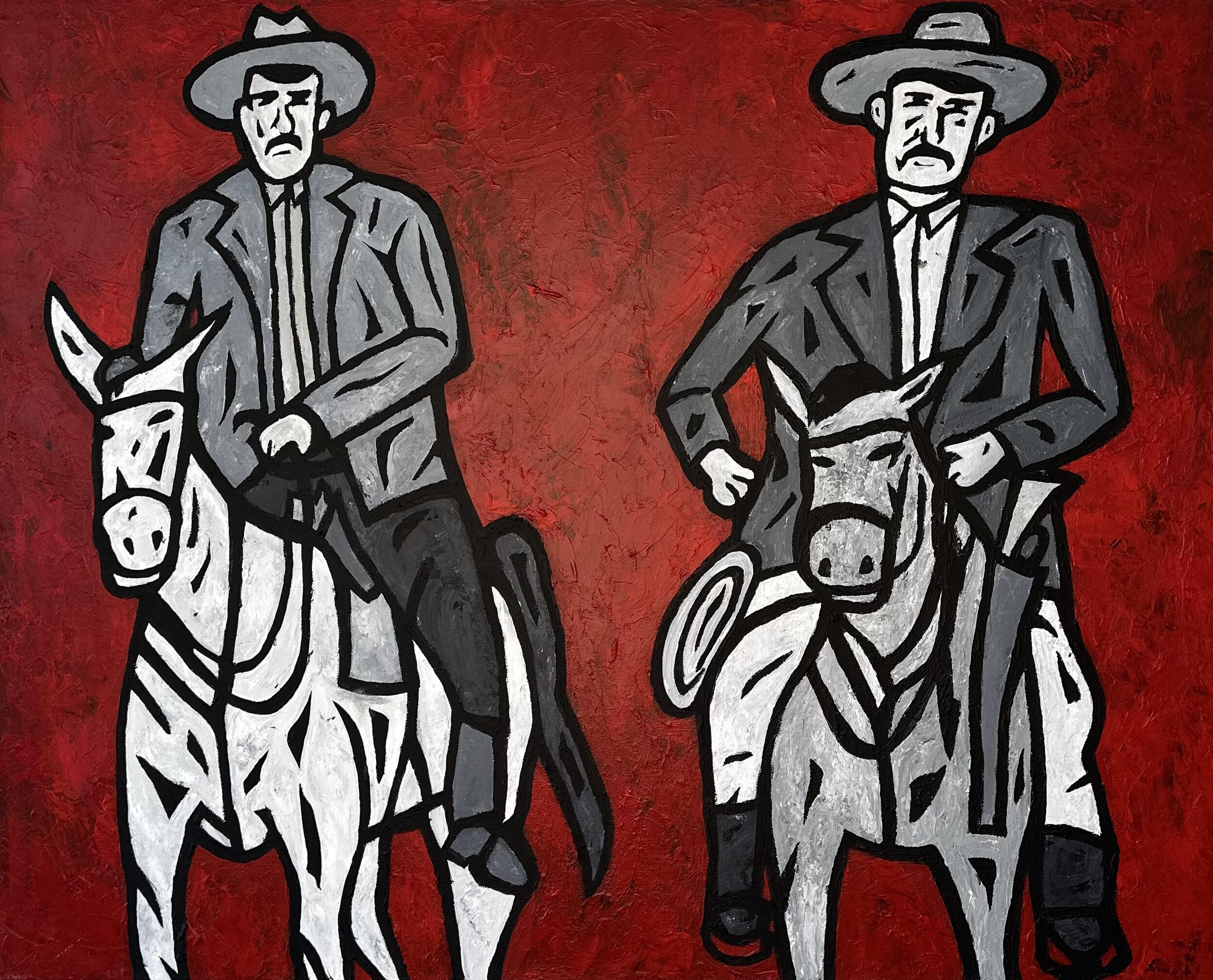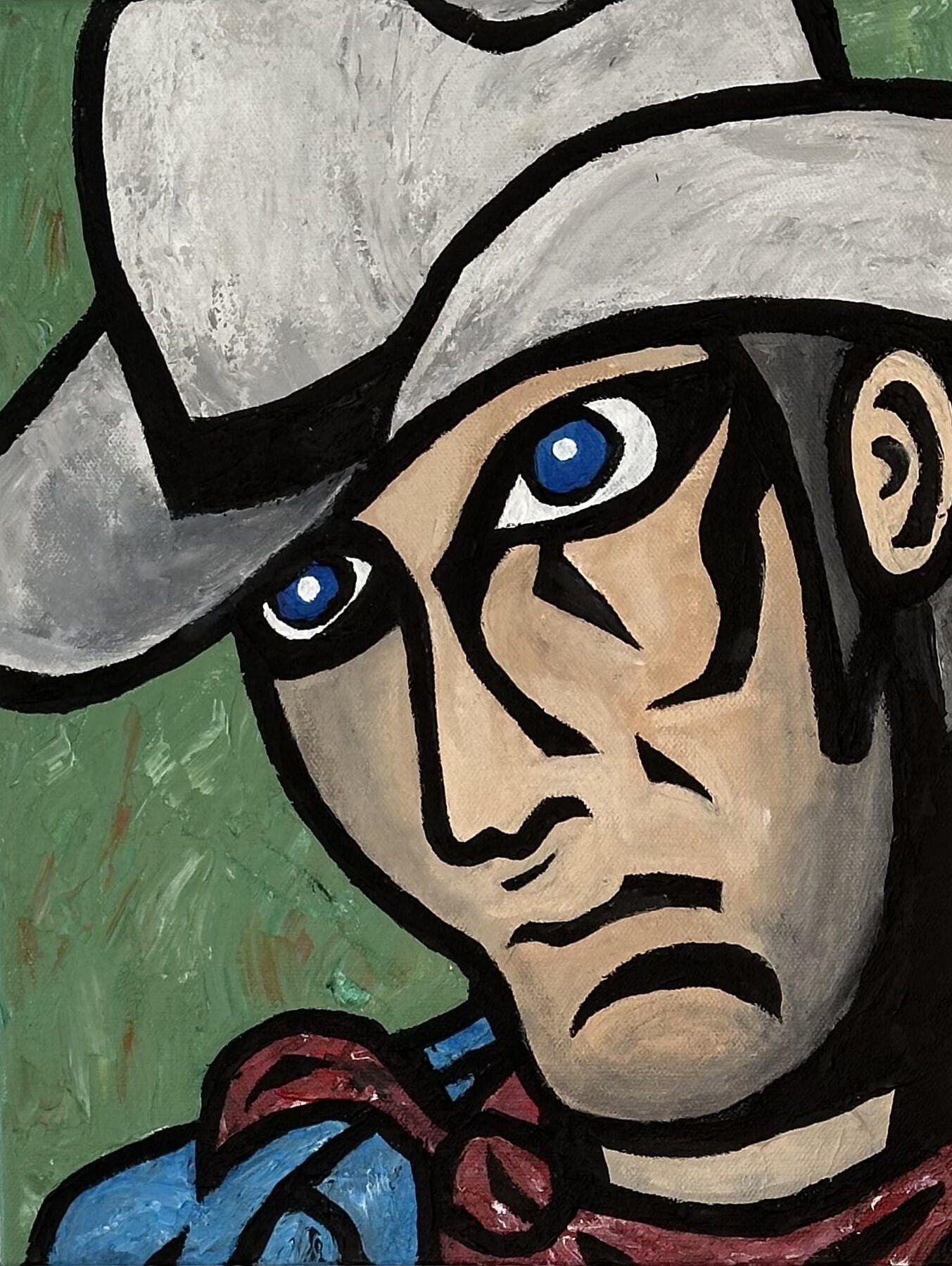 "Borracho" captures the wild, unfiltered spirit of a cowboy from long ago—worn down by hard living and strong drink. The abstract style reflects his fractured state, blurring the line between grit, humor, and sorrow in the Old West.