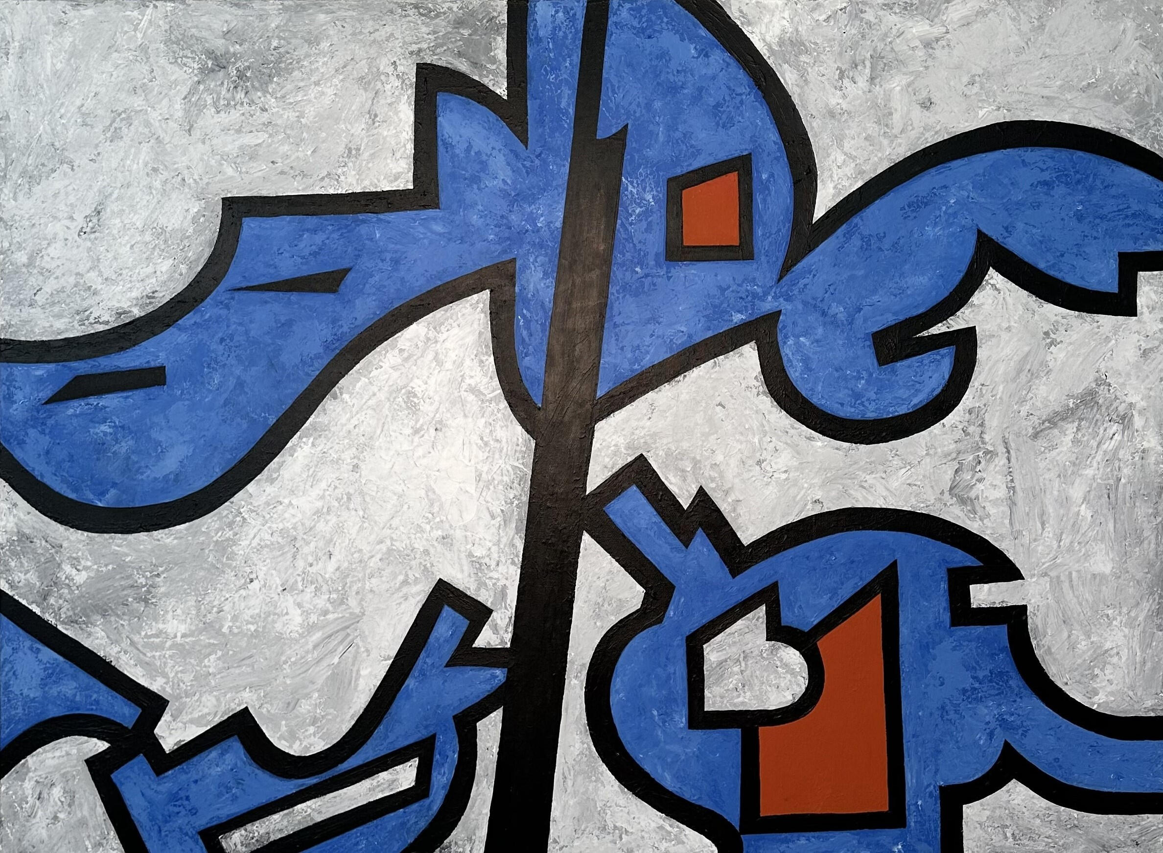 "Contrail" turns skyward patterns into coded symbols of belief and doubt. Inspired by conspiracy theories, the painting’s sharp lines and layered blues evoke both the beauty and unease of unseen forces at work—an abstract reflection on how mystery and imagination shape the stories we tell ourselves.