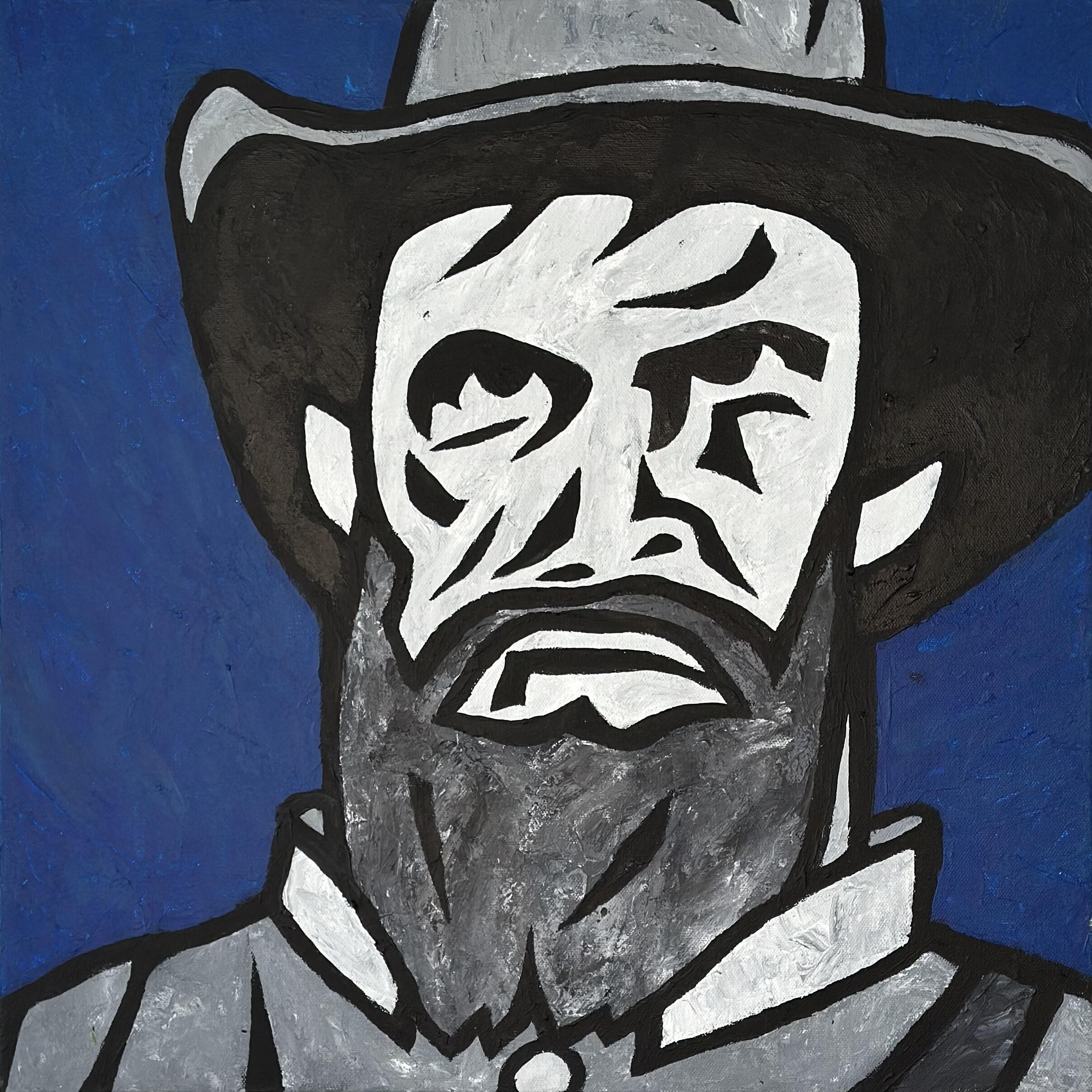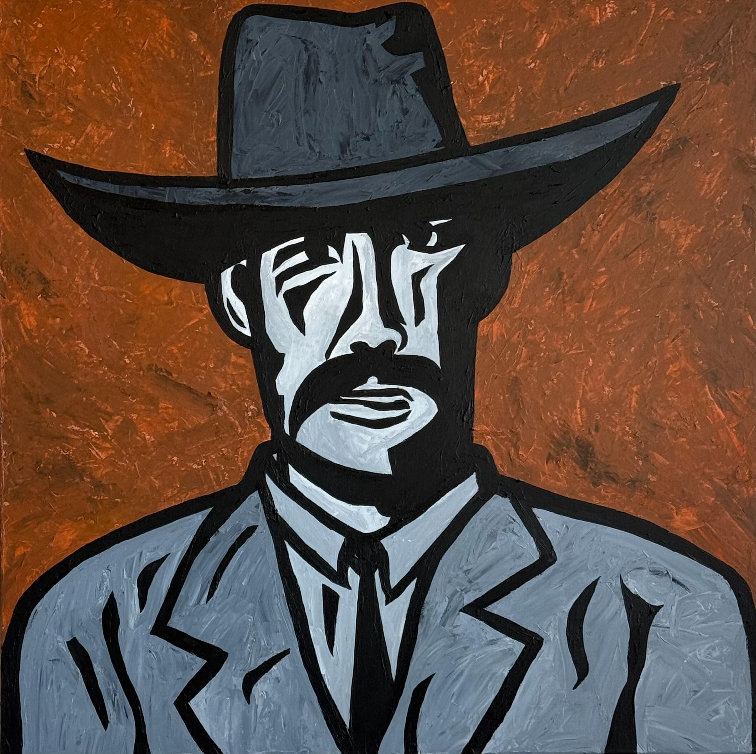 Inspired from an old photograph from Texas history, "Texas Ranger" pays tribute to the legendary lawmen who brought justice to the untamed frontier. With bold lines and a hardened gaze, the painting captures the courage, authority, and quiet resolve of a figure shaped by duty, danger, and the rugged land of Texas.