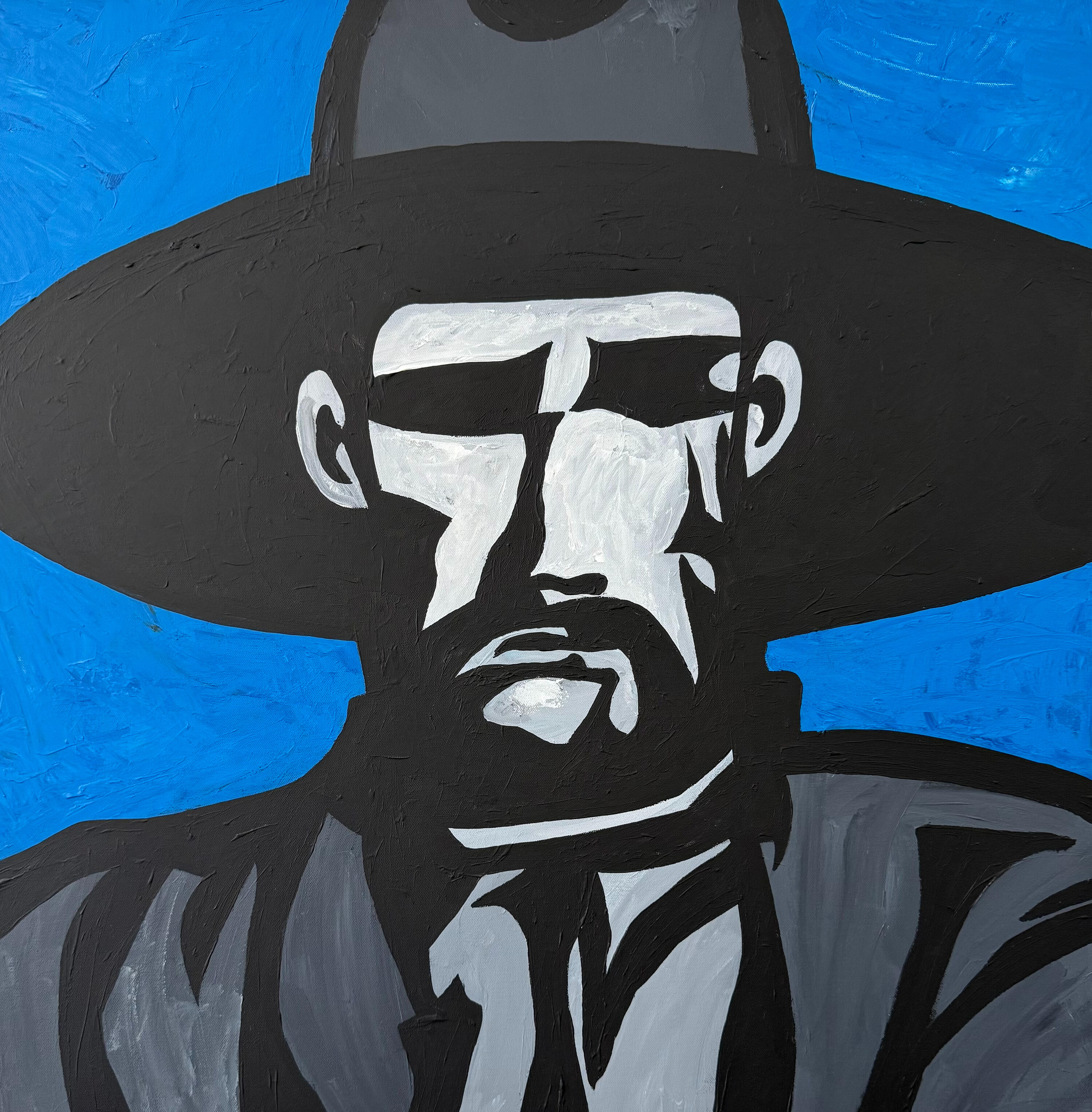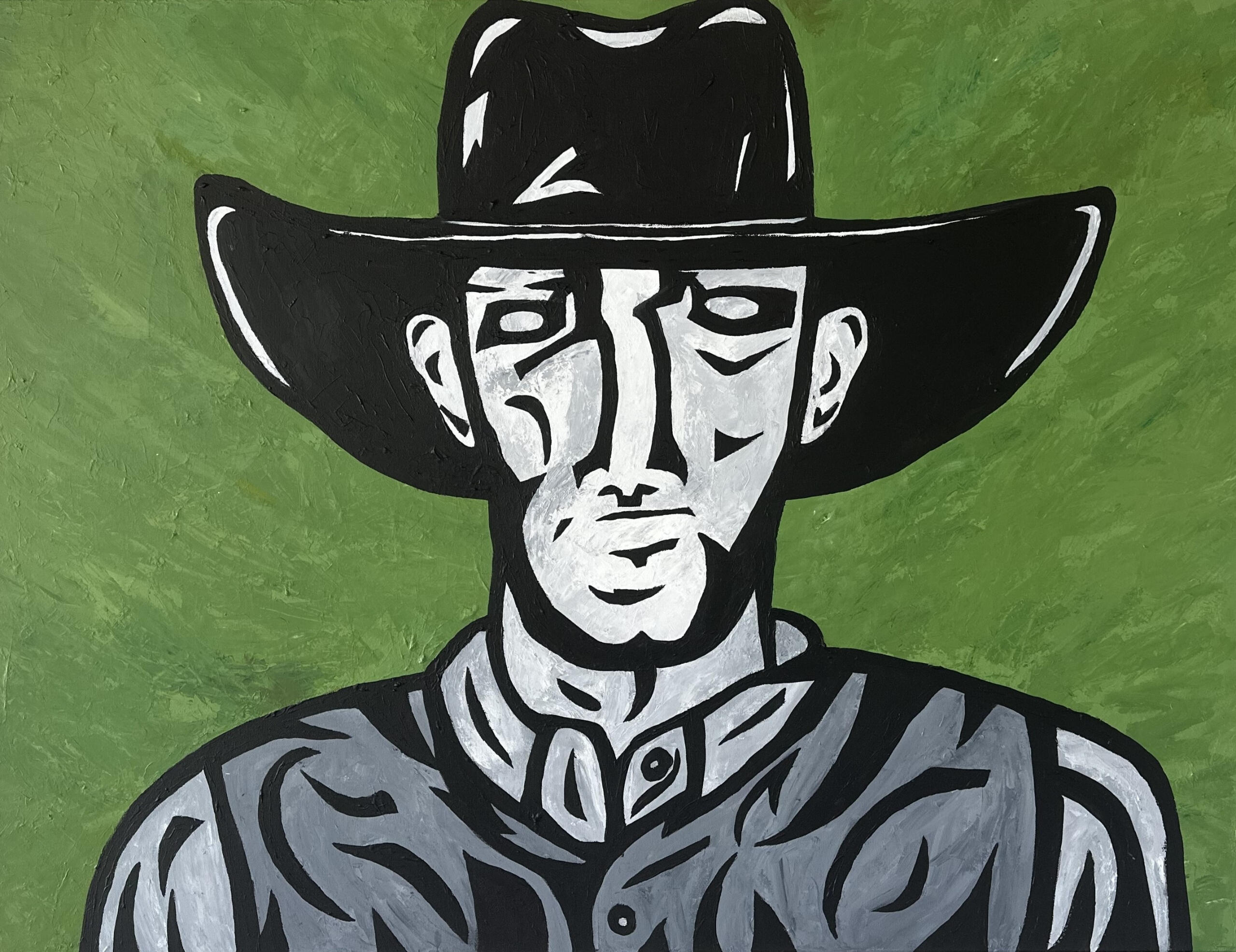 “Desperado” is inspired by an old photograph of a lone cowboy, capturing the grit, mystery, and quiet defiance etched into a weathered face. A modern, bold tribute to the timeless outlaw spirit of the American West.