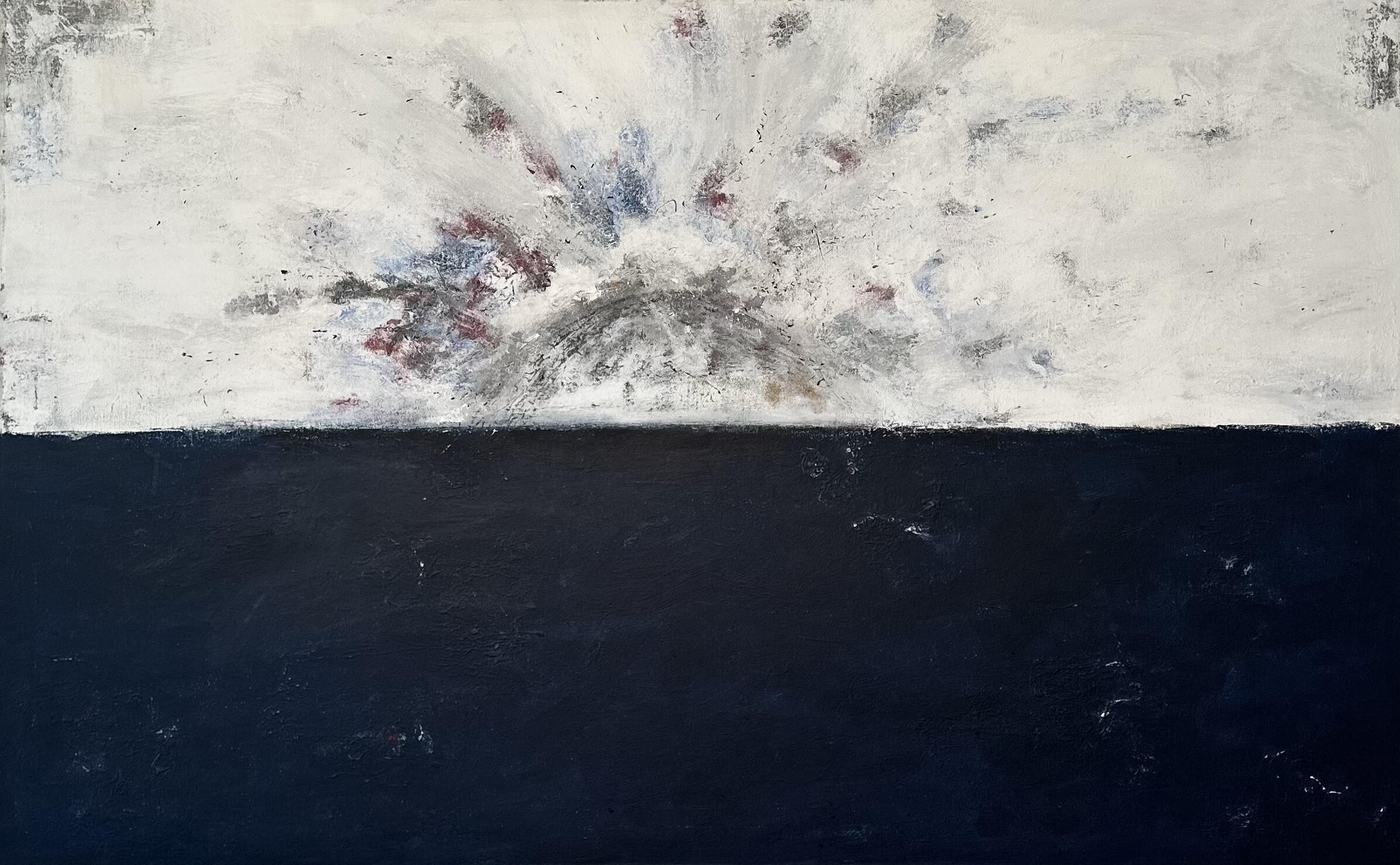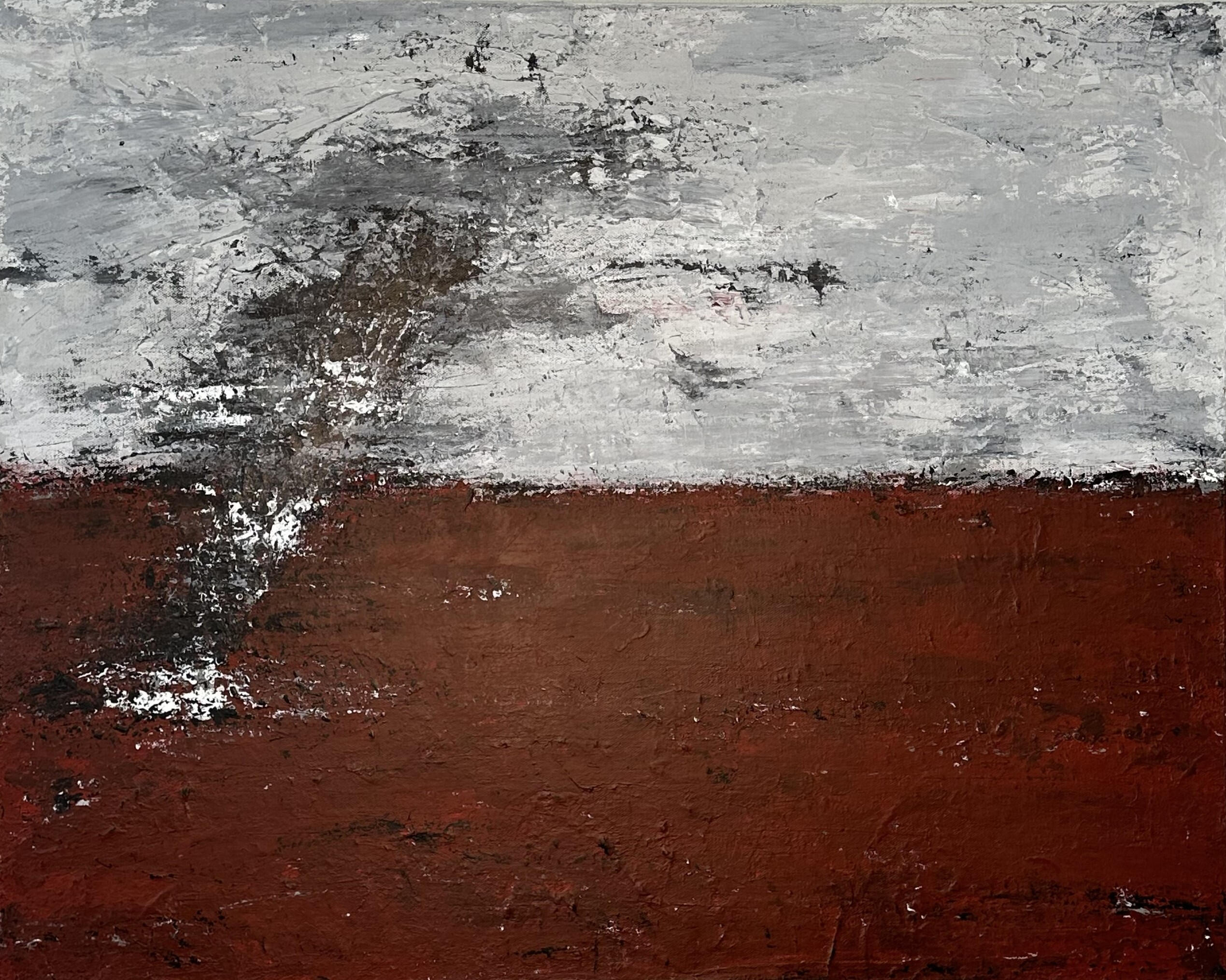 "Interruption" reflects the tension of being silenced mid-thought. The bold divide between stormy gray and deep red evokes emotion colliding with restraint. Inspired by the artist’s experience of constant disruption, it captures the struggle to be heard through layers of interruption.